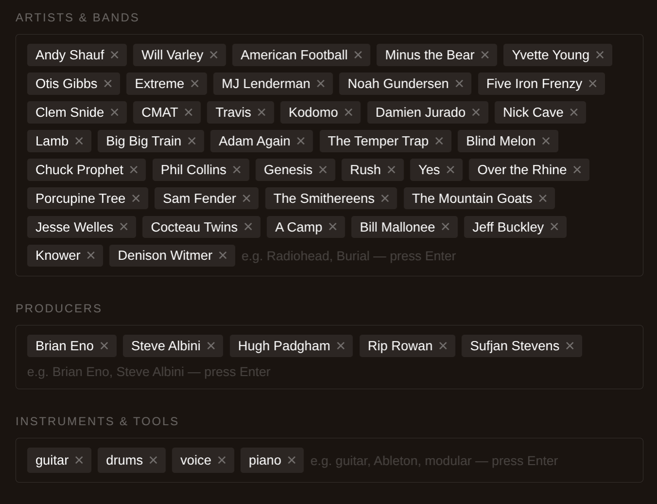 “Producers and engineers” suggested a shorter number. I entered my friend and collaborator Rip Rowan, famous for coining the term “Loudness Wars”.1 Having put Denison Witmer and Sufjan Stevens in the artists section, I thought, “Didn’t Sufjan produce Denison’s latest record?” Yes, yes he did.